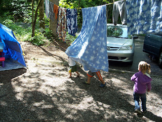 After our first night of rain, we hung up a clothes line to dry everything out. The kids thought that running under this sheet was the best thing ever!
